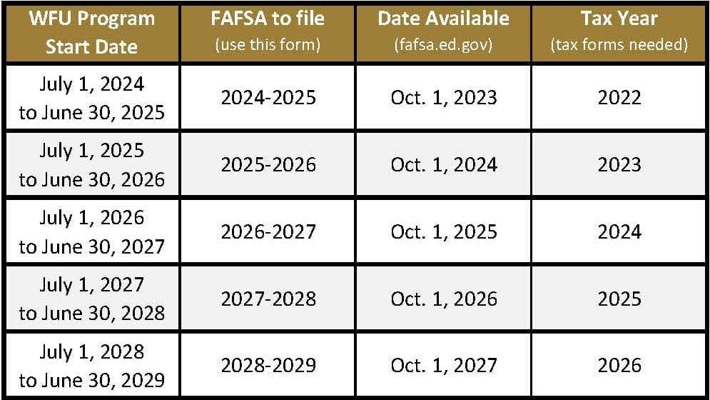 Students seeking financial aid must complete the Free Application for Federal Student Aid (FAFSA). The Wake Forest University School of Business Title IV Code is E00515. Individuals will not be considered for federal student loans until the FAFSA has been submitted to the U.S. Department of Education and a student aid report is received by the School of Business financial aid office. To determine which FAFSA to complete, please reference the chart below (click to expand).